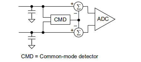 用这些值方程11,最低3.28µs示例所需的时间。精密ADC支持全微分输入模式。如图22-6所示,当差分模式为时选择(ADC14DIF = 1),两个输入处的输入共模电压(VCM)由共模检测器(CMD)。CMD具有独特的共模电压检测电路允许VCM被设置为从0 V到VREF的任意值,而不会降低设备性能。检测到的共模电压从每个输入信号被拒绝。共模电压包含共模噪声,它在差分模式下被各输入信号拒绝,使精度ADC为真ADC14DIF = 1时的差分输入模数转换器。