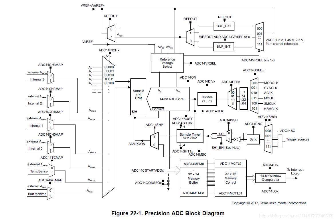 精密ADC模块可以使用芯片上的共享参考模块,该参考模块提供1.2 V、1.45 V和2.5 V三个可选电压级别(配置细节请参阅REF模块一章)VR +和VR -。这些参考电压可用于内部和外部的引脚VREF+。或者,可以通过引脚VREF+/VeREF+和VeREF-分别为VR+和VR -提供外部参考。TI建议在使用ADC14VRSEL设置时将VeREF-连接到机载地面1110或1111 b。