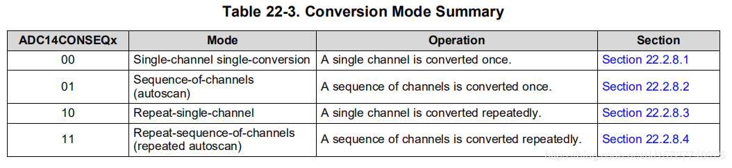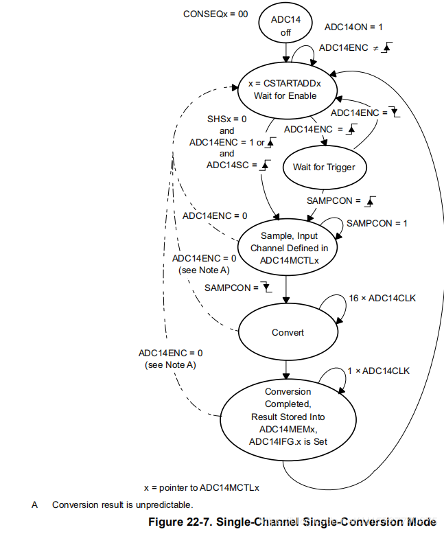 ModeA单通道采样转换一次。ADC结果被写入由CSTARTADDx位定义的ADC14MEMx。图22-7为14位模式adc14res = 03h时单通道单转换模式的流程。当ADC14SC触发转换时,可以由ADC14SC位触发连续的转换。当使用任何其他触发器源时,必须在每次转换之间切换ADC14ENC。低脉冲持续时间必须至少三个ADC14CLK周期