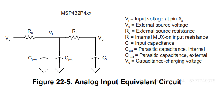 当SAMPCON = 0时,所有Ax输入均为高阻抗。当SAMPCON = 1时,选取的Ax输入在采样时间tsample中可以建模为RC低通滤波器(图22-5)。一个内部的互连输入电阻RI(见设备专用数据表)与电容器CI串联(参见特定于设备的数据表)由源查看。电容CI电压VC必须被充电到源电压VS的二分之一LSB内进行精确的n位转换,其中n是所需的分辨率。