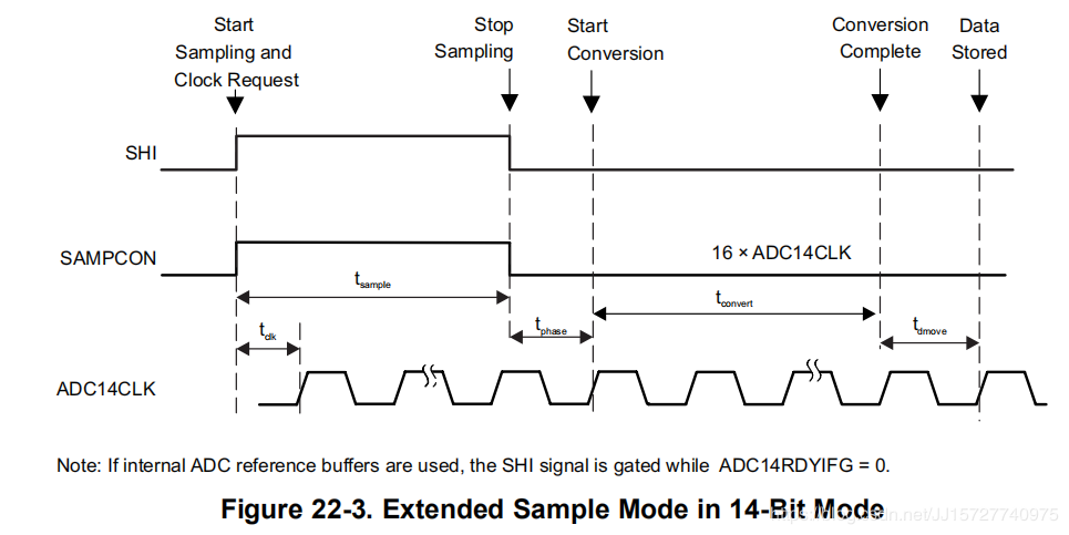 22.2.6.1扩展样本模式当ADC14SHP = 0时选择扩展样本模式。SHI信号直接控制SAMPCON并定义样本周期tsample的长度。如果使用ADC内部缓冲区,应用程序应该断言样本触发器,等待ADC14RDYIFG标志被设置(指示ADC本地缓冲引用的精度已经确定),然后在断言之前保持断言样本触发器一段时间。或者,如果使用内部ADC缓冲区,用户可以断言所需的样本时间的样本触发器,以及引用和缓冲区要解决的最大时间(具体到设备的数据表中提供了引用和缓冲区解决时间)。最大采样时间不得超过420秒。当ADC14VRSEL= 0001或1111时,使用ADC内部缓冲区。高到低的SAMPCON转换在与ADC14CLK相位校准后开始转换(见图22-3和表22-1)