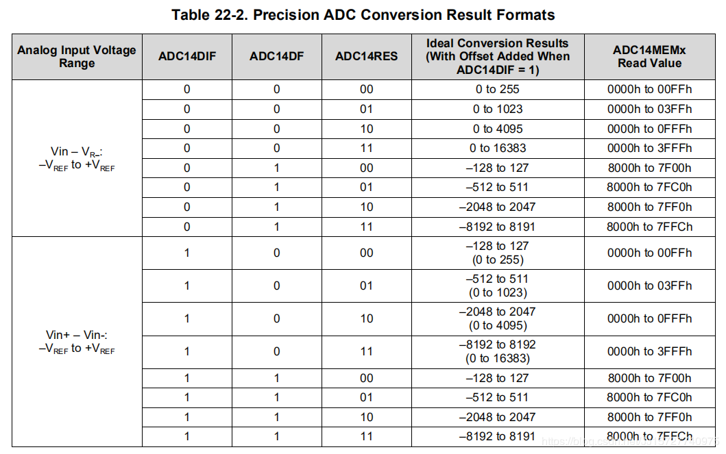 转换结果总是以二进制无符号格式存储。对于差分输入,这意味着结果的偏移量为8192,从而使数字为正数。数据格式为ADC14DF在ADC14CTL1允许用户将转换结果读取为二进制无符号或有符号二进制(2s补码)