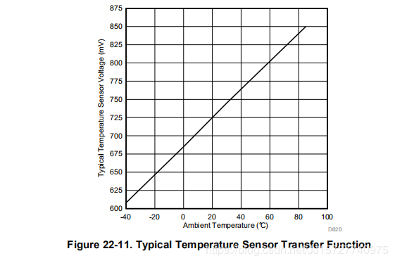 采用集成温度传感器使用片上温度传感器,通过在ADC14CTL1寄存器中将ADC14TCMAP位设置为1,使温度传感器输入通道成为可能。选择模拟输入通道ADC14INCHx = MAX 1,其中MAX为温度传感器零启动计数时设备外部ADC输入通道的最大数量。如果选择了外部通道,则进行任何其他配置,包括引用选择和转换内存选择。温度传感器在REF模块中。图22-11为典型的温度传感器传递函数。这里显示的传递函数只是一个例子。需要进行校准,以确定特定设备的相应电压。使用温度传感器时,样品周期必须大于5 s。温度传感器的偏置误差可能很大,大多数应用都需要校准。温度校准值可在TLV描述符中使用(有关位置,请参阅特定于设备的数据表)。REF模块中使用温度传感器时,REFON位必须设置为1。转换温度传感器的参考选择与任何其他ADC通道相同。