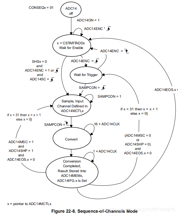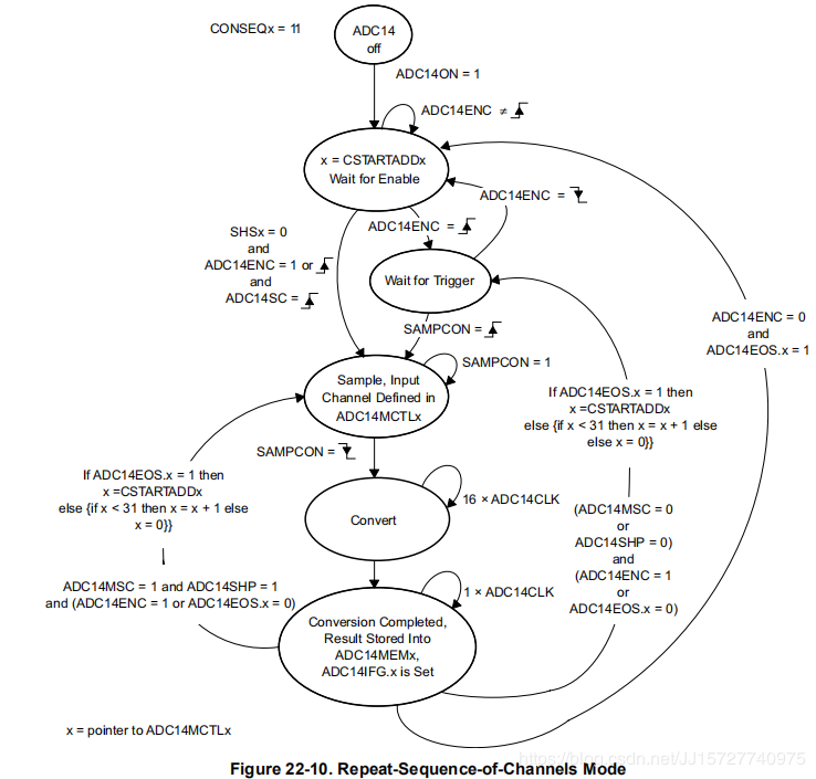 如果没有设置ADC14EOS位,并且选择了序列模式,则重置ADC14ENC位不会停止序列。要停止序列,首先选择单通道模式,然后重置ADC14ENC。