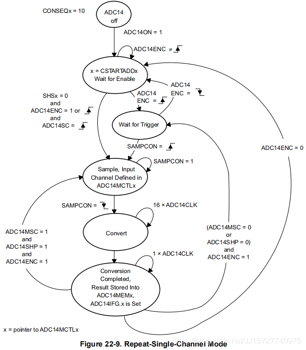 对单个通道进行采样并连续转换。ADC结果被写入由CSTARTADDx位定义的ADC14MEMx。在完成转换之后读取结果是必要的,因为只使用了一个ADC14MEMx内存,并被下一次转换覆盖。图22-9显示了14位模式ADC14RES = 03h时的重复单通道模式。低脉冲持续时间必须至少三个ADC14CLK周期 。