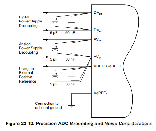 22.2.11精密ADC接地和噪声考虑与任何高分辨率ADC一样,应遵循适当的印刷电路板布局和接地技术,以消除接地回路、不必要的寄生效应和噪声。当从ADC返回的电流流过与其他模拟或数字电路相同的路径时,就会形成接地回路。如果不小心,这个电流可以产生小的不需要的偏置电压,可以增加或减去参考电压或输入电压的ADC。图22-12显示了防止接地回路的连接。除接地外,由数字开关或开关电源引起的电源线路上的纹波和噪声尖峰也会破坏转换结果。为了达到高精度,建议采用单点连接的独立模拟和数字接地板的无噪声设计。