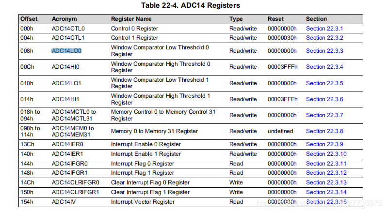 •ADC14LOIFG、ADC14INIFG和ADC14HIIFG用于ADC14MEMx