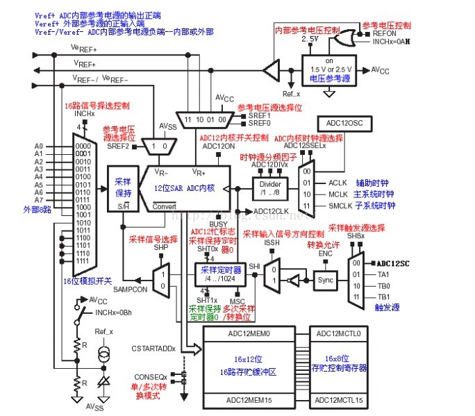 第一个是ADC12模块的时钟,这个是模块运行时的时钟,跟采样定时器是两个概念,曾经我有一段时间被迷惑住了。这个由ADC12CTL1里面的ADC12SSEL和ADC12DIV配置,可以选择ADC12OSC/ACLK/SMCLK/MCLK,TI例程里面好像都是选择的ADC12OSC,这个是5MHZ,不过频率容易受外界影响而改变。这个部分配置好了就得到了ADC12CLK。