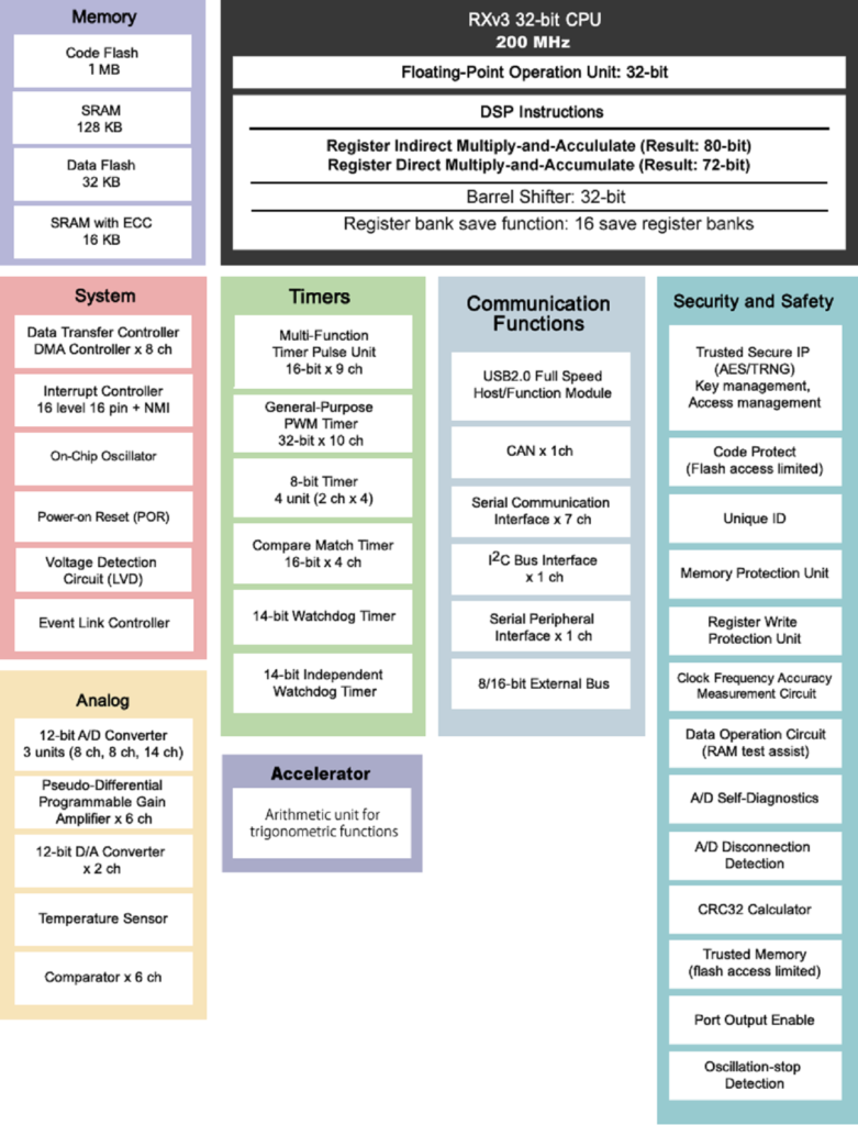 伺服控制MCU的框图,在左第二栏中显示了计时器和加速器(图片:瑞萨电子)。