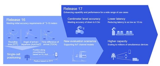 精确的终端定位对于诸多垂直应用至关重要。基于蜂窝技术的定位可与现有的全球导航卫星系统(GNSS)互补,而且既适用于户外定位也满足室内定位要求。随着市场对更强大的终端定位能力的需求愈加迫切,5G Rel-16规范率先增加了定位支持,定义了如往返时间(RTT)、到达角/出发角(AoA/AoD)和到达时间差(TDOA)等关键技术。接下来,Rel-17将进一步提升定位精度、降低时延、扩大容量,并将定位精度降低至厘米级。这些演进对工业物联网用例尤为重要。