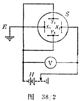 照图38/2组装电路,其中H是可变高压电源,V是电压表,S是荧光屏,X1、X2、Y1和Y2是偏转板,E是接地电极。