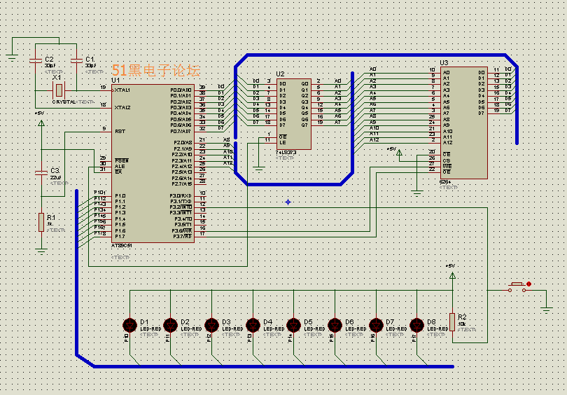 8051单片机芯片扩展数据存储器完整案例下面是proteus仿真原理图:
