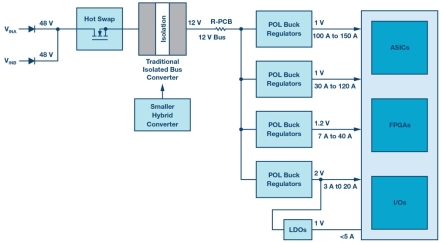 图 1.传统的电信板电源系统架构带有隔离式总线转换器。在 48 V 已经与交流电源隔离的系统中,无需使用隔离式总线转换器。使用非隔离混合式转换器取代隔离式转换器可显著简化设计、降低成本和电路板空间要求。