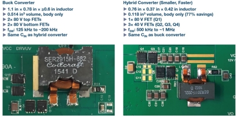 图 2.传统非隔离式降压型转换器和混合式转换器的尺寸对比(48 V 至 12 V/20 A)。