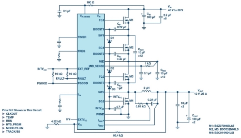 图 3.采用 LTC7821 的 48 V 至 12 V/25 A 混合式转换器。