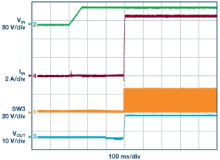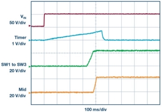 图 7.LTC7821 启动时的预平衡周期避免了高浪涌电流。