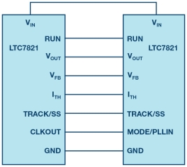 LTC7821 易于扩展,因此非常适合高电流应用,例如电信和数据中心的应用。图 9 显示了使用多个 LTC7821 的 2 相混合式转换器的关键信号连接。将一个 LTC7821 的 PLLIN 引脚和另一个 LTC7821 的 CLKOUT 引脚连接在一起,使 PWM 信号同步。