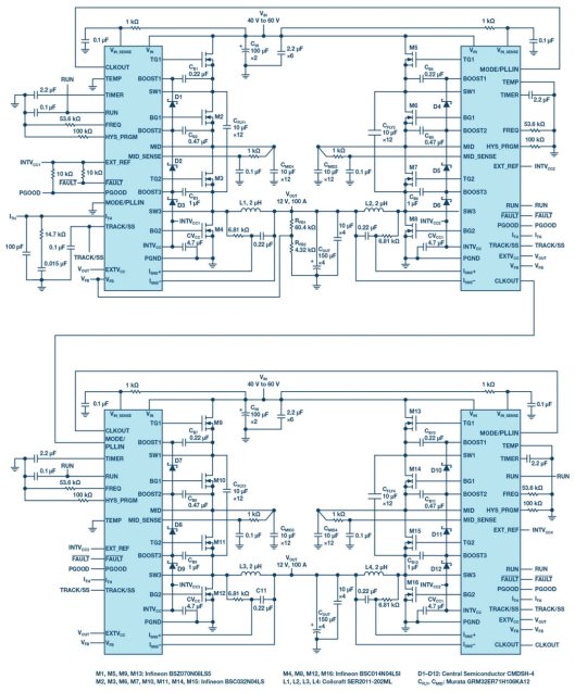 图 10.采用四个 LTC7821 的 4 相 1.2 kW 混合式转换器。