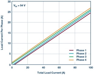 图 10 显示了一个 4 相 1.2 kW 混合式转换器。每相功率级与图 3 中的单相设计相同。输入电压范围为 40 V 至 60 V,输出为 12 V,最大负载为 100 A。其峰值效率为 97.5%,满载效率为97.1%,如图 11 所示。其热性能如图 12 所示。在 23°C 的环境温度和 200 LFM 强制风冷的情况下,其热点为 81°C。该设计采用了电感 DCR 检测。如图 13 所示,4 个相位间的均流非常平衡。