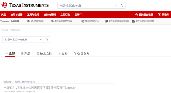 在KEILv5的目录下,可以从刚刚下载的芯片包中找到相关驱动库,为避免麻烦,我们直接从官网下载相关库,进入TI官网,搜索MSP432DriverLib,点击搜索结果: