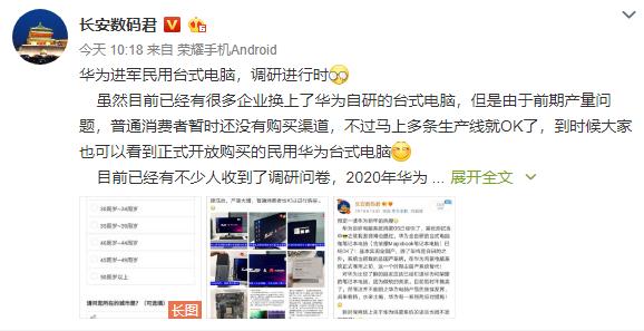 众所周知,华为公司的笔记本电脑业务可谓是做得风生水起,此前推出的多款笔记本电脑都火爆热销,已经吸引了一定粉丝数量。近日,微博网友@长安数码君 发布消息称,华为打算进军民用台式电脑市场,目前已经开启市场调研工作。