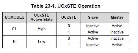 UCxSTE 用于4线模式,此时允许在1条总线有多个主机,它不用于3线模式。表23-1 描述了UCxSTE操作。