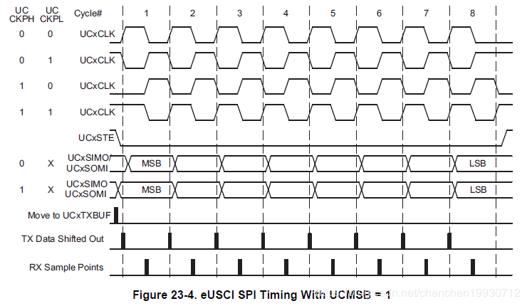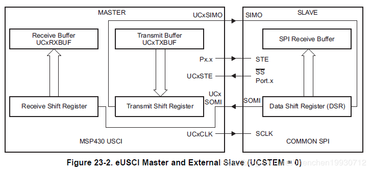 如果UCSTEM = 1 在4线制主机模式,UCxSTE 是数据输出端口。这种模式下,UCxSTE会自动生成单个从机的从机使能信号。对应的行为可以看图23-4.