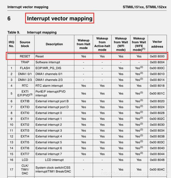 下图摘自datasheet,可见0x8000存的是Reset复位中断向量,单片机每次上电或者复位都先执行复位中断,也就是从0x8000开始执行。
