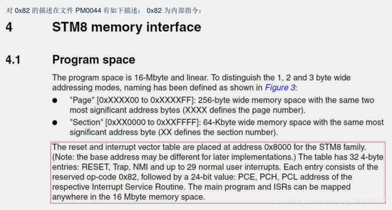 在stm8中,0x82后面会跟着24位的地址(PCE+PCH+PCL),cpu最大寻址2^24=16M空间