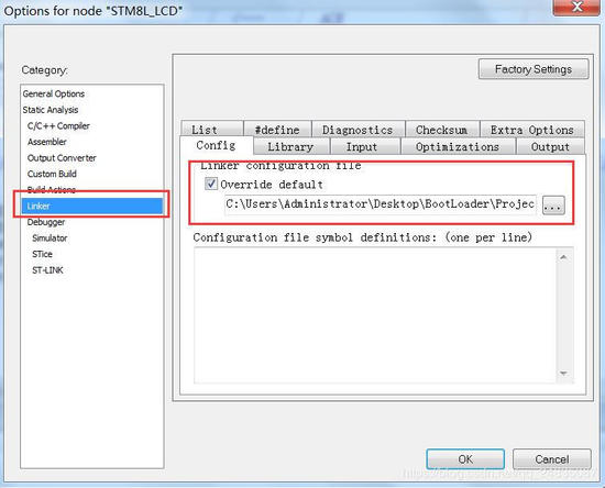 在这里面可以看到好多.icf后缀的文件,然后选择一个和芯片一致的,我就选择lnkstm8l152c6.icf,复制到我们的工程里面,再在IAR里面如下设置
