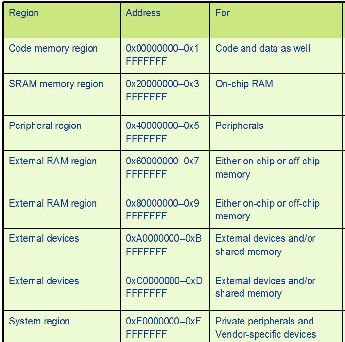 Overall, the 4 GB memory space can be divided into ranges as shown in picture below. The Cortex-M3 design has an internal bus infrastructure optimized for this memory usage.
