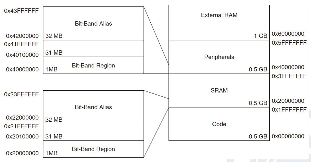 SRAM Bit-band alias - Direct accesses to this memory range behave as SRAM memory accesses, but this region is also bit addressable through bit-band alias.