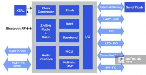 AB1526 是联发科收购的一家名叫络达科技的产品,这是一款全集成的单芯片,支持蓝牙 4.2 双模认证,支持 HFP1.6 和 AAC 解码器,并且可以支持自定义双 MiC 的宽频语音,可以获得良好的降噪和回声消除功能。通过下图的硬件系统框图可以看到,AB1526 内嵌串行闪存,更灵活地支持客户软件升级和第三方软件移植。凭借优化的 MCU 结构,接口布局和更好的 DSP 算法,AB1526 在大多数蓝牙音频应用中提供了更高的性能和语音和音乐质量。