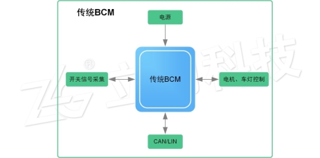 传统的BCM主要是通过采集门锁开关信号、车窗升降信号、雨刮信号、灯光控制信号等,通过驱动继电器或者IC直接驱动各类电机和车灯,大致功能框图如下: