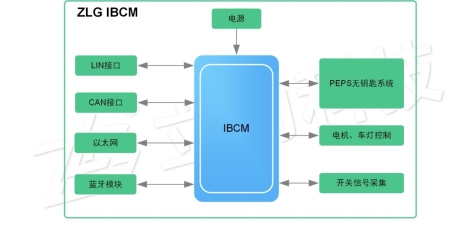 汽车性能不断地提高,车身域的控制器也随即增加,BCM上对LIN、CAN、以太网的需求也明显增多,基于此,ZLG推出的高度集成的IBCM解决方案,在传统BCM的基础上,集成更多的通信接口和PEPS无钥匙系统,ZLG IBCM解决方案框图如下: