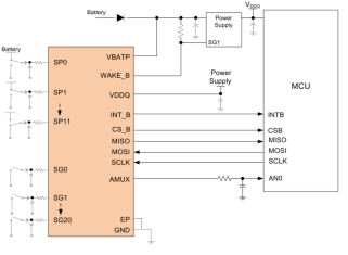 7) 开关采集:采用NXP的MC33CD1030AE,可以检测33个开关触点的闭合和断开动作,通过SPI将开关状态传递给MCU。产品支持过压、欠压、过温、短路等保护,每个采集通道还可以支持多种湿电流配置,大大提升了产品可靠性,产品应用框图如下: