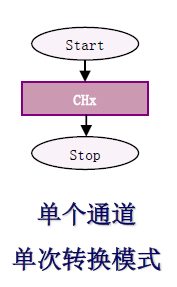 该模式既可通过设置ADC_CR2寄存器的ADON位(只适用于规则通道)启动也可通过外部触发启动(适用于规则通道或注入通道),这时CONT位为0。
