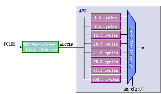 ADCCLK---最快可达14MHz, 时钟来自经过分频器的PCLK2(2、4、6、8分频)