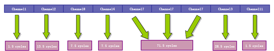 在14MHz和采样时间位1.5周期时 转换时间:1μs (14个周期 cycles)