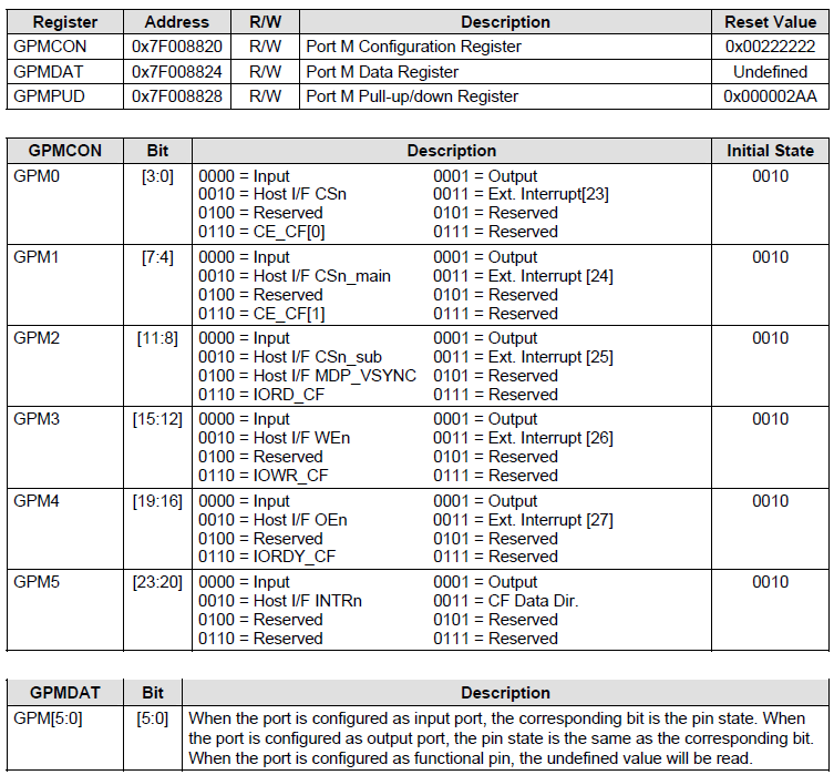 然后打开S3C6410X User's Manual,查找GPM相关的寄存器:
