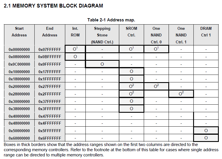 3.使用ld来链接.o文件时,一般会指定-Ttext选项,表示该代码会在内存的哪个地址加载,通过查看User's Manual,你可以决定这个地址的范围,如下图,0x50000000-0x6FFFFFFF地址区间映射到DRAM上,所以绝大部分的资料中,S3C6410中的内存地址都是0x5xxxxxxx类似的地址。也有一些0xcxxxxxxx类似的地址,这是打开SoC中的MMU后进行物理地址和虚拟地址映射后的结果,如果打开了MMU,就可以使用0xcxxxxxxx这样的地址,否则无法使用。