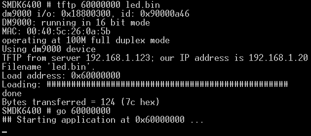 然后make,可以得到led.bin,通过tftp下载到开发板中: