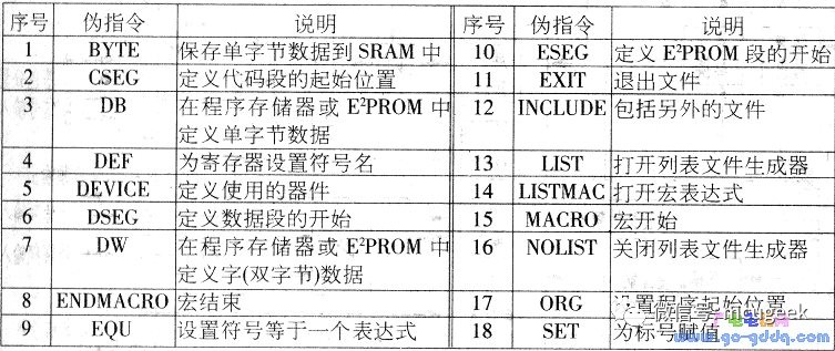 伪指令不属于单片机的指令系统,而是由汇编器提供的指令,用于调整存储器中程序的位置、定义宏、初始化存储器等。AVR单片机的汇编器共提供18条伪指令(见附表)。