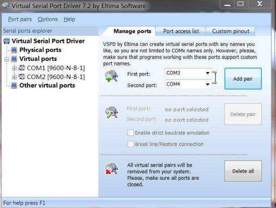 打开虚拟串口软件,建立COM1和COM2为相互连接的一对端口。