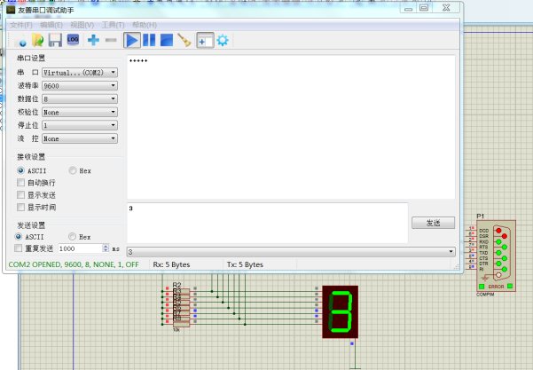 启动友善串口助手,选择COM2发送数据。向单片机发送数字3,观察单片机仿真结果。