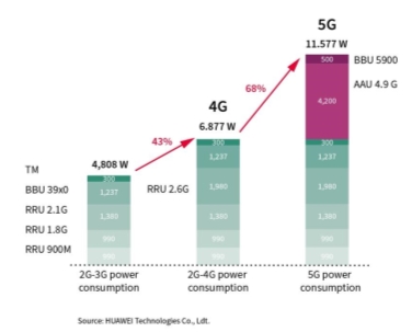 尽管5G网络通常比第四代通信技术效率更高,但每个小区(cell)由于容量增大将导致整体功率消耗大幅上升。导致这些的原因是由于在每个无线电信道上使用了大规模多输入多输出(Massive MIMO)天线来改善信号质量。与通常使用4T4R(4个发射器,4个接收器)的4G基站相比,5G基站使用64T64R。