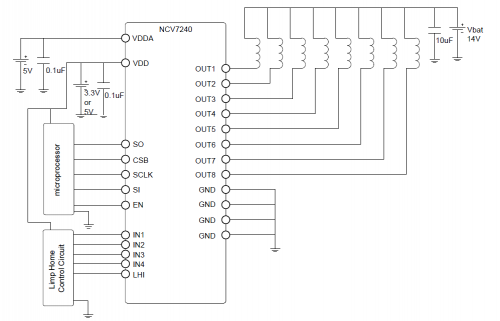 NCV7240 包含八个独立的热传感器,位于每个输出驱动器附近。当检测器检测到过热事件(通常为 175℃)时,通道将被锁存。在该通道被锁存的时候还可以操作未受影响的通道。