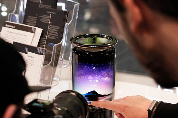 搭载AMOLED触摸显示屏与远场语音识别技术的Mirage柔屏智能音箱,是柔宇科技与Cleer品牌联合发布的一款“柔性+智能家居”产品,音箱正面搭载一块约8英寸的柔宇自主研发生产的全柔性显示屏,可以大角度显示文字、图片和视频等信息。