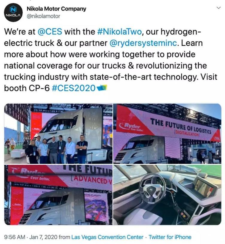 Nikola汽车公司发的推特,与合作伙伴之一的Ryder在CES上展示了未来主义风格的车型