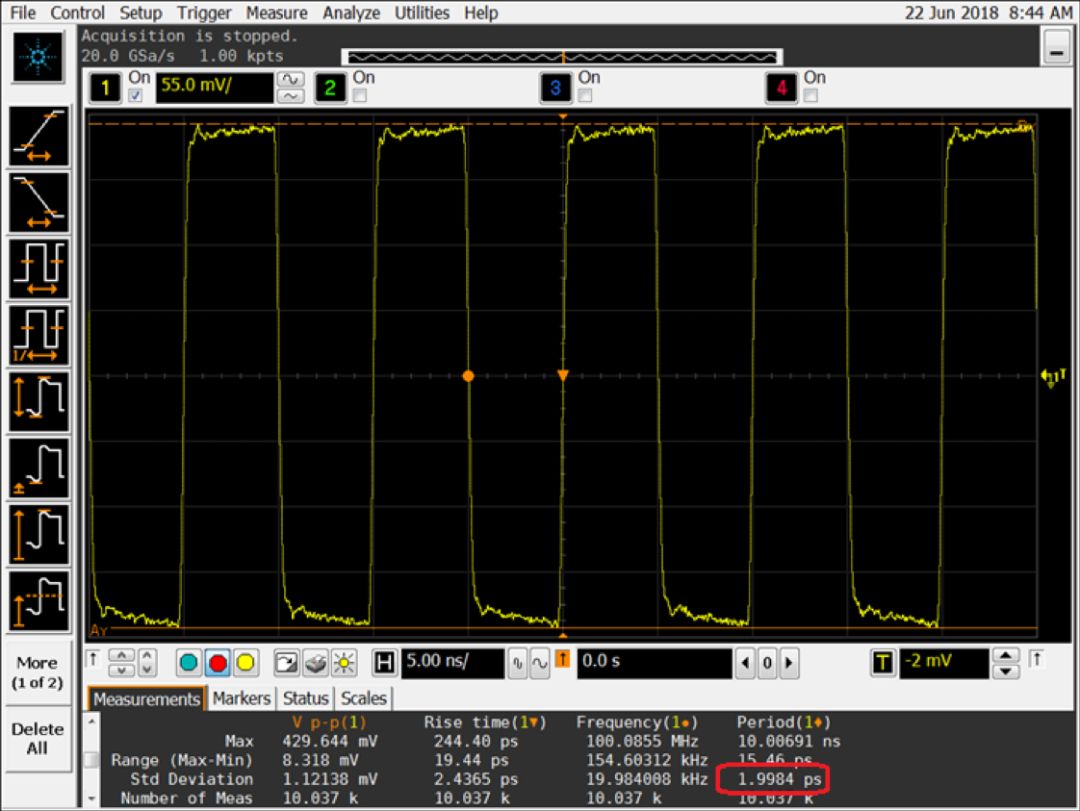 最终选择最大化了示波器上显示的波形,而没有削波。周期抖动降至约2 ps。